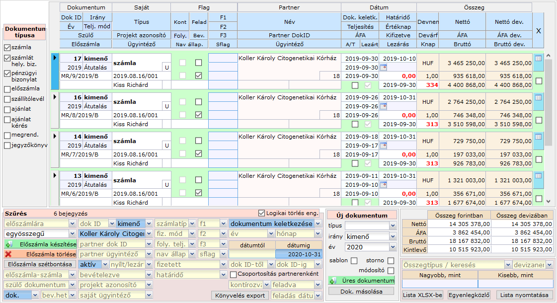 • bizonylattípusok: számla, számlát helyettesítő bizonylat, pénzügyi bizonylat