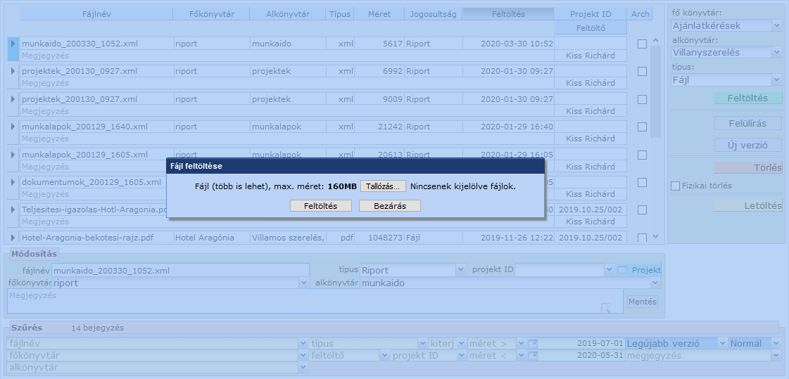 • feltöltő: az állományt feltöltő személy nevére szűkíthetjük vele a listát