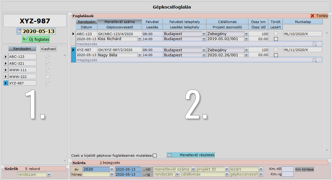 - Akkor a jobb oldali panelen megjelenik egy új sorban a foglalásunk. A foglalással egyidejűleg egy menetlevél is létrejött. A rendszám, a dátum és a menetlevél száma mezők automatikusan kitöltésre kerülnek, a többi mezőt töltsük ki, a részleteket alább ismertetjük.