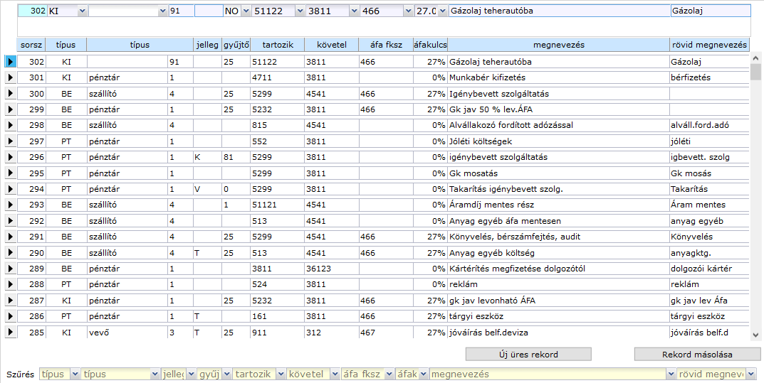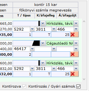 Kattintás után minden egyes tétel sorában megjelennek a kontírozáshoz szükséges segédmezők; egyelőre üresen.