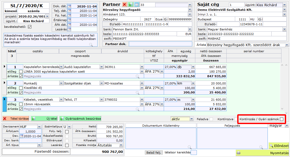 Kattintsunk a Bizonylat részletei űrlapon a tétellista alatt jobb oldalon a 'Kontírozás / gyári számok' jelölőnégyzetre.