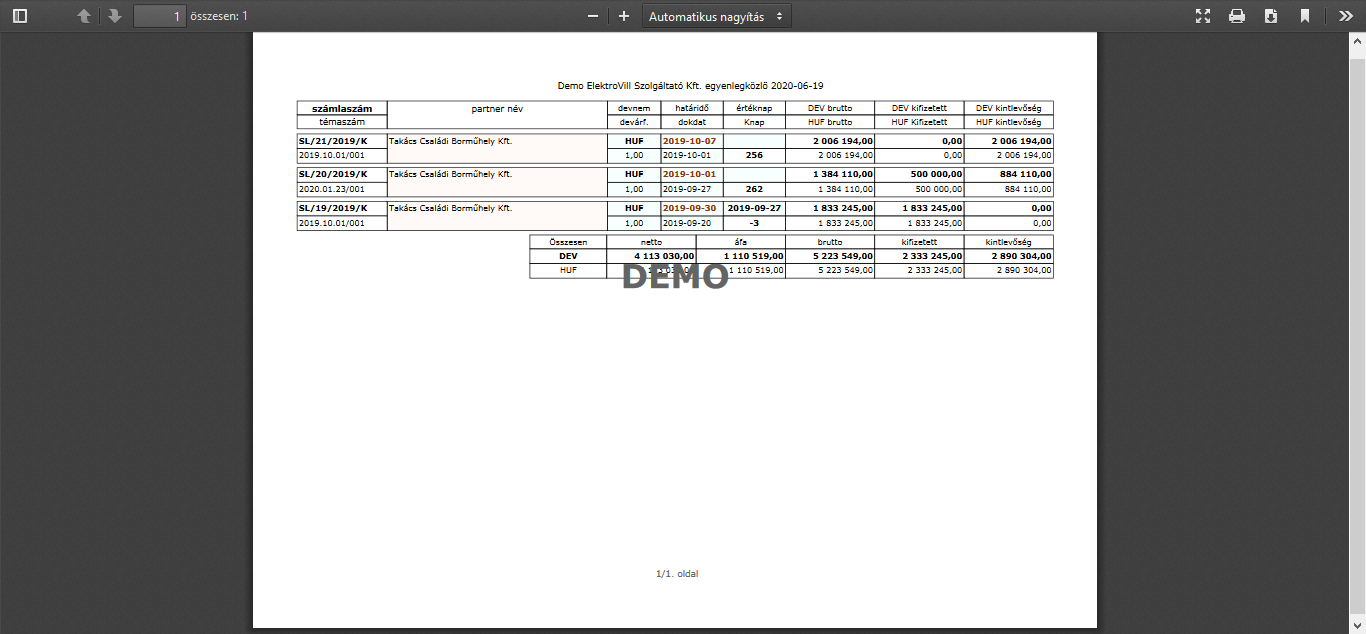 A gombra kattintva a listában aktuálisan szereplő összes bizonylat fizetési adatait PDF állományba rendezi és új lapon megnyílik az egyenlegközlő előnézete.