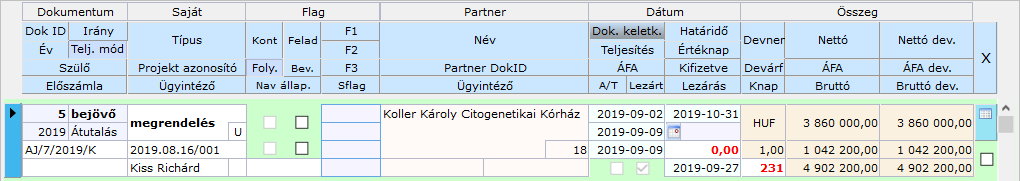 Egy bizonylat adatainak beazonosításában segítséget nyújtanak a fejlécmező címkék, illetve az azokat csoportosító, szürke hátterű mezők. Balról jobbra haladva ezeket a mezőcsoportokat látjuk: