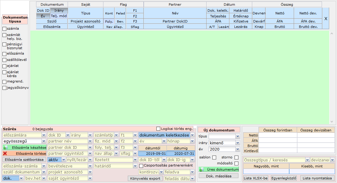 Az űrlap megnyitásakor a típusválasztóban egyetlen bizonylattípus sincs aktiválva, ezért a lista üres. Ha a típusválasztóban egy vagy több típust kiválasztunk, a listában megjelennek a választott típusnak megfelelő bizonylataink.