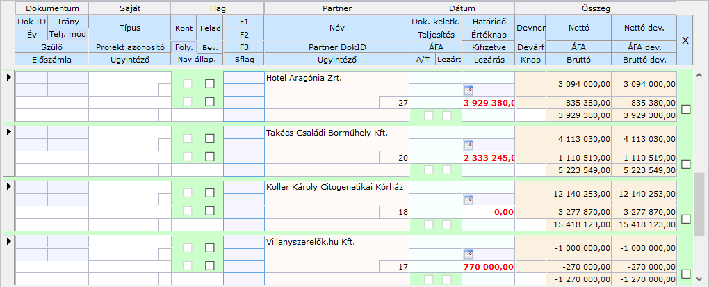 A lista egy sora egy bizonylatnak felel meg, amit a bal oldalán látható mutatónyíl is jelöl. Egy sorban több adat - jellemzően a bizonylat fejlécadatai és az összegre vonatkozó adatok - is megjelenik, ezek egymás alatt és mellett szerepelnek, de a sort a mutatónyíl összefogja.